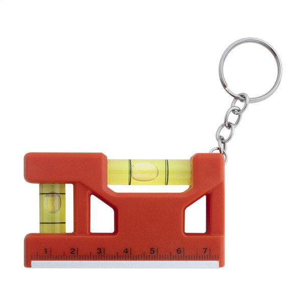 Multifunktionaler Schlüsselanhänger aus recyceltem ABS mit Metallring, Lineal, Magnet und zwei Wasserwaagen.