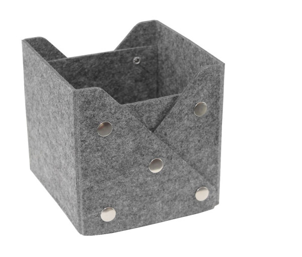 Die faltbare Utensilienbox aus rPET Filz mit Druckknöpfen ist eine kompakte und vielseitige Aufbewahrungslösung und passt perfekt auf Tische oder Regale. Die Box kommt flach verpackt im Polybeutel und lässt sich dank der Druckknöpfe einfach und schnell aufbauen. Maße 15 x 15 x 15cm. VE 24/0 Stück.