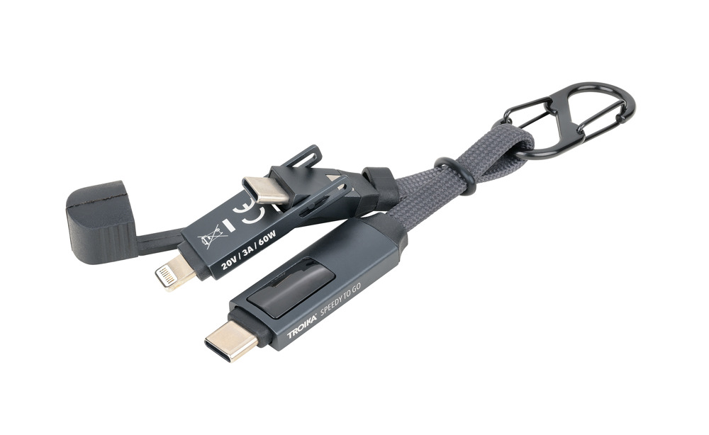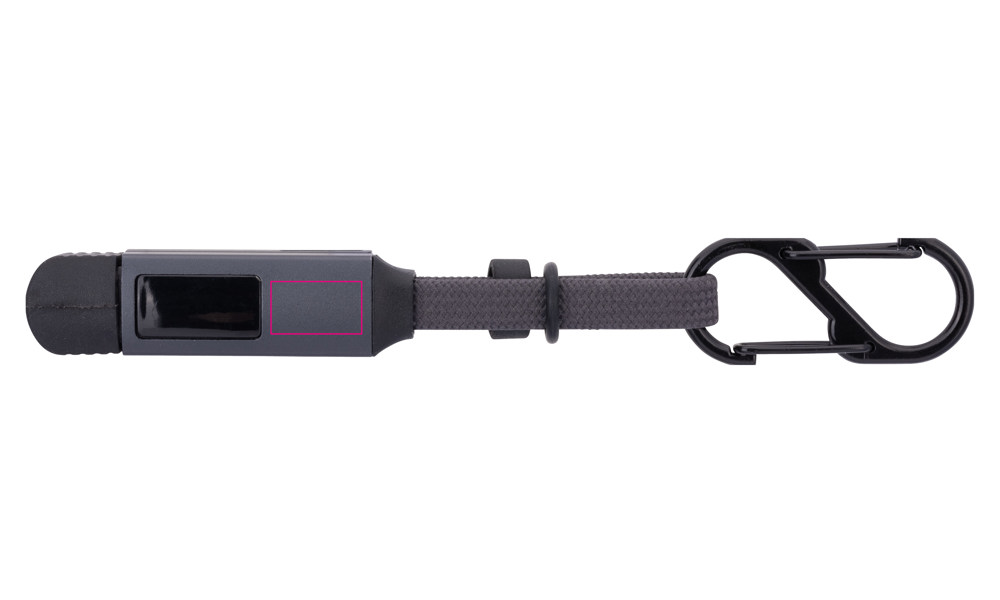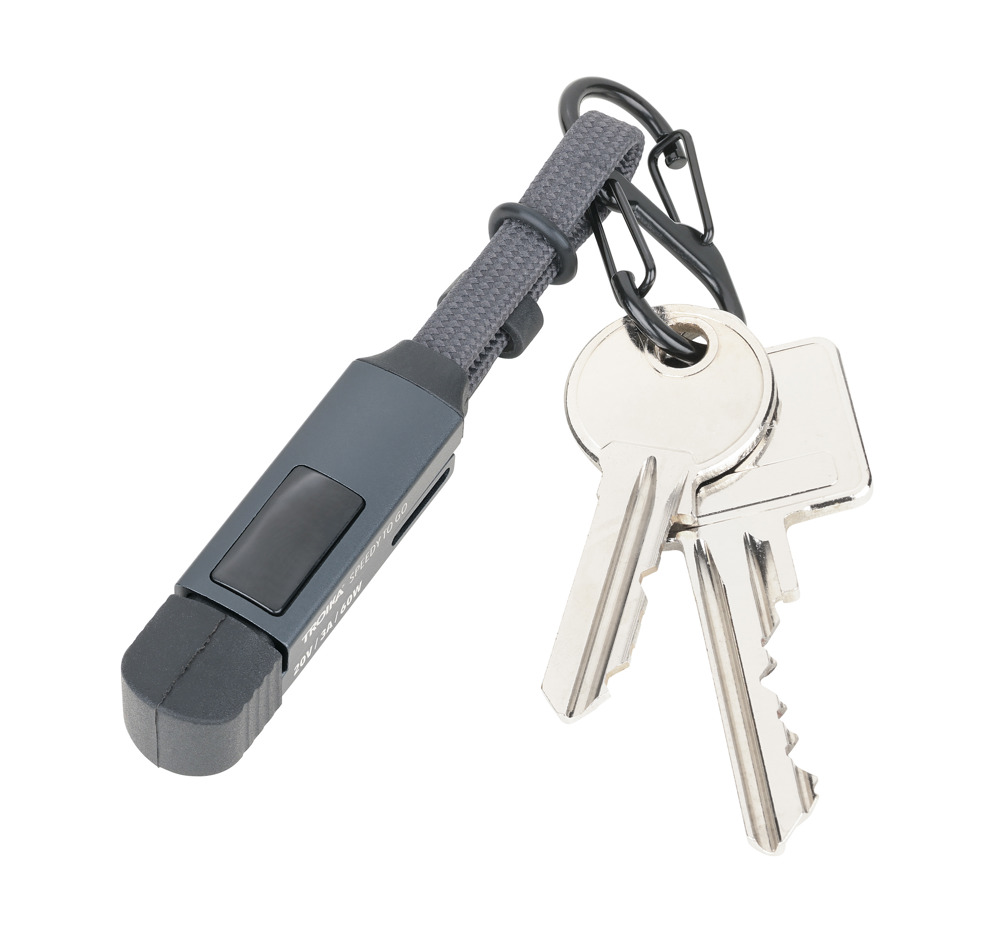 Taschenanhänger mit Ladekabel: High-Speed USB-C 60W PD Power Delivery auf USB-C, mit Datenübertragungsfunktion, volle Ladekapazität: max. 60W|20V|3A (ohne Adapter), abhängig vom zu beladenen Gerät, mit digitaler Anzeige der Ladeleistung, inkl. USB-C auf Lightning Adapter, mit Doppelkarabiner zur Befestigung an Schlüsselbund, (Sport-)Tasche o.Ä., mit Magnetverschluss und Kappe, Aluminium, recyceltes Nylon, schwarz/titanfarben