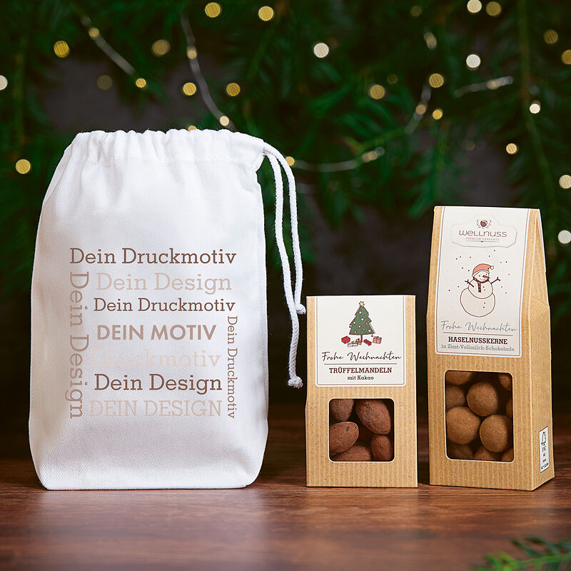 Ab 100 Stück mit Ihrem Motiv auf dem Baumwollsäckchen: Wählen Sie aus einem breiten Sortiment von edlen Nüssen, verführerischer Schokolade und Trockenfrüchten. Mit Liebe konfektioniert in Deutschland. Sie suchen eine andere Größe? Dieses Premium Präsent ist auch mit 1, 2 oder 3 Faltschachteln erhältlich.
