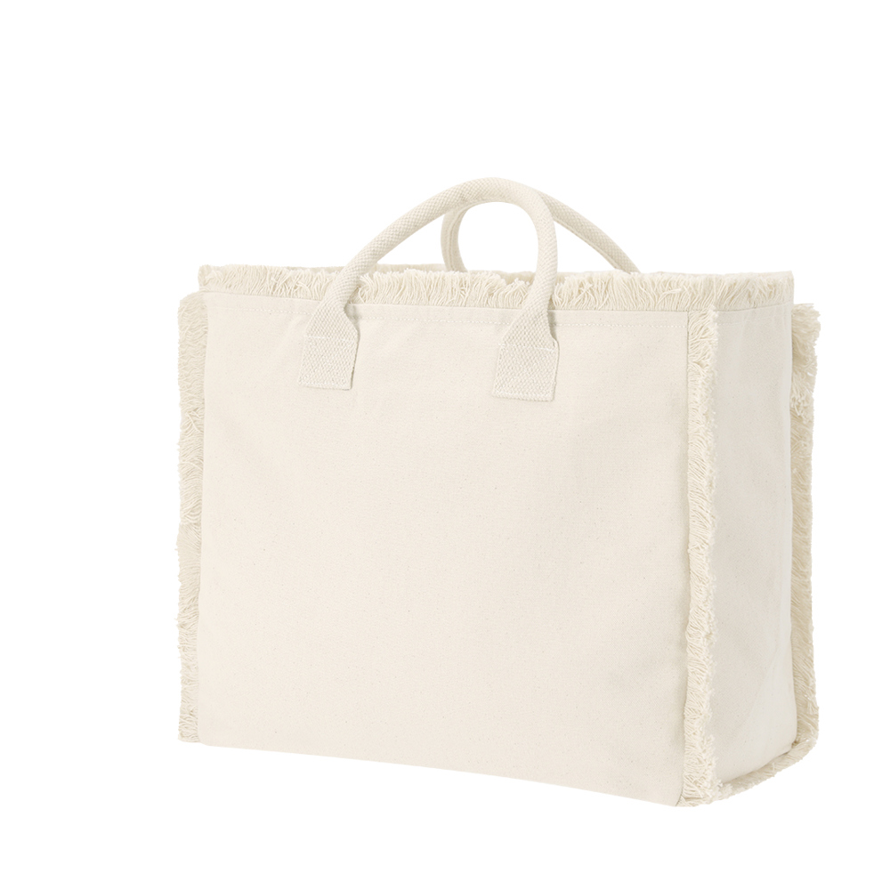 Tasche im Fransen-Stil, hauptsächlich aus 360 g/m2 Baumwolle gefertigt. Mit praktischem und modernem Design, beinhaltet verstärkte kurze Griffe. Enthält einen Reißverschluss für zusätzliche Sicherheit und eine Innentasche mit Reißverschluss.