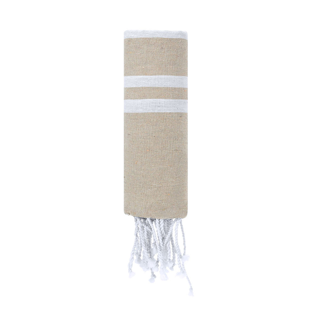 Weicher Pareo-Handtuch von 150 g/m2 in einer Kombination aus Baumwolle und Polyester. Sein Design hat einen bunten Hintergrund mit weißen Streifen. Enthält Fransen an den Enden, die ein dekoratives Detail hinzufügen und den Abschluss vervollständigen.