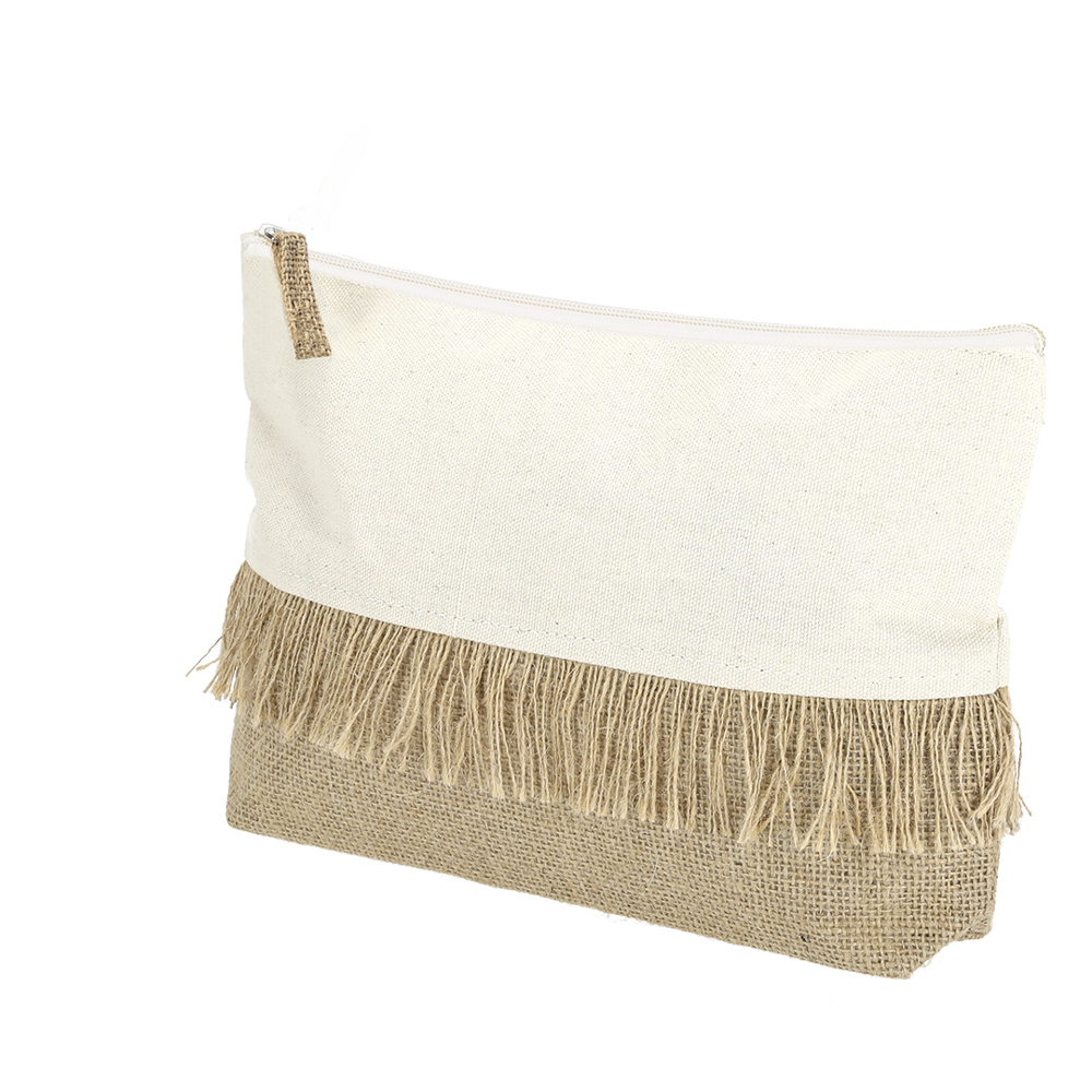 Necessaire aus laminiertem Jute und natürlicher Baumwolle. Mit auffälligen Fransen, Reißverschluss in natürlicher Farbe und Juteband.