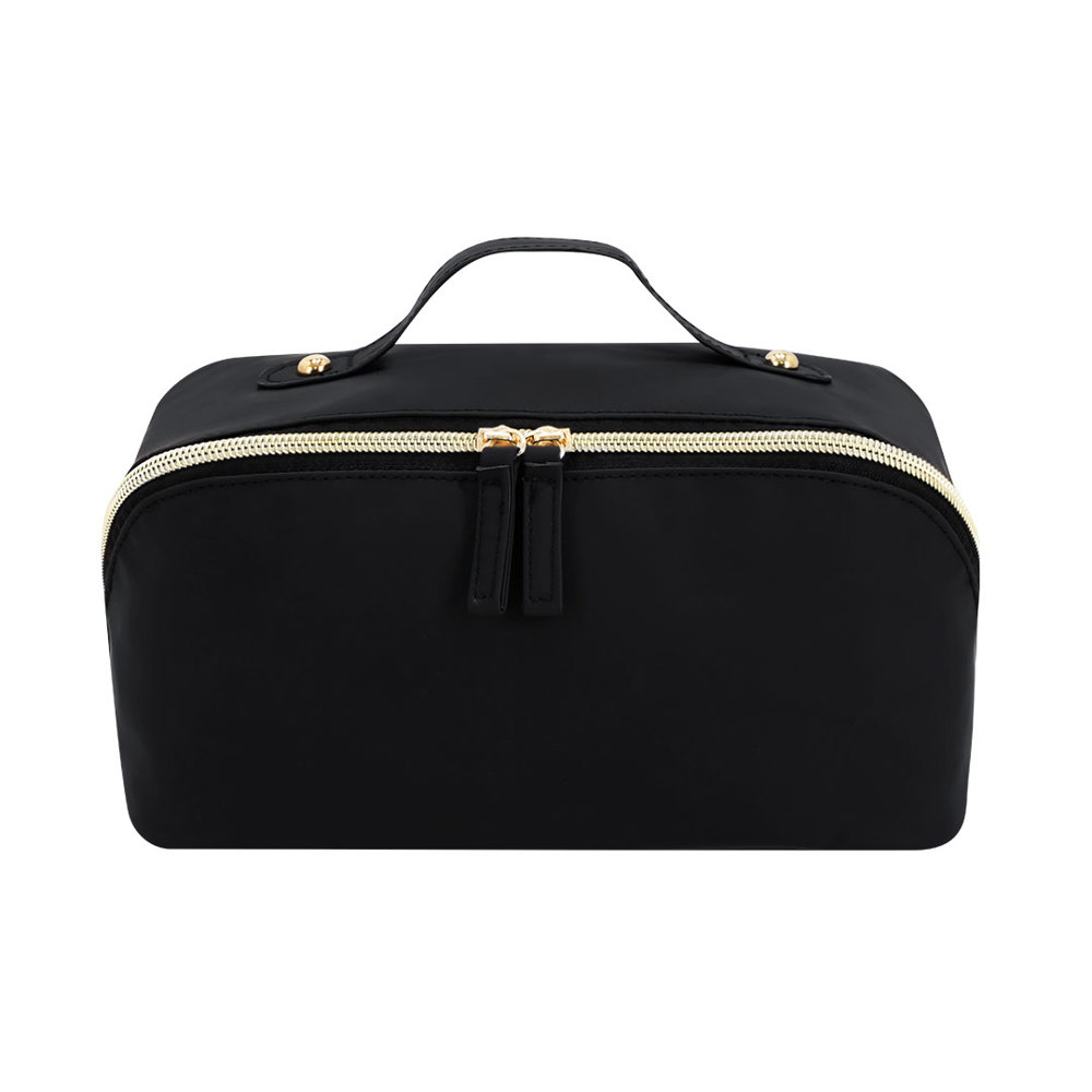 Necessaire aus weichem PU mit Hauptfach von großer Öffnung. Mit passenden PU-Ziehband und gelbem Reißverschluss. Innen mit doppeltem Fach und zusätzlichem Reißverschluss-Tasche.