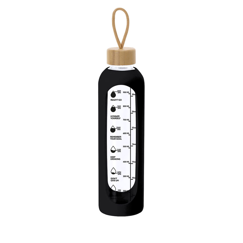 Flasche aus 1L Glas, entworfen, um eine angemessene Hydration zu fördern. Mit einer Silikonhülle, die schützt und einen bequemen und sicheren Halt bietet.Inklusive Kapazitätsanzeige in Litern und Unzen, begleitet von motivierenden Sätzen, die dazu inspirieren, eine angemessene Hydration täglich aufrechtzuerhalten. Der Deckel, aus Bambus gefertigt, hat eine praktische Kordel für einfachen Transport. BPA-frei.