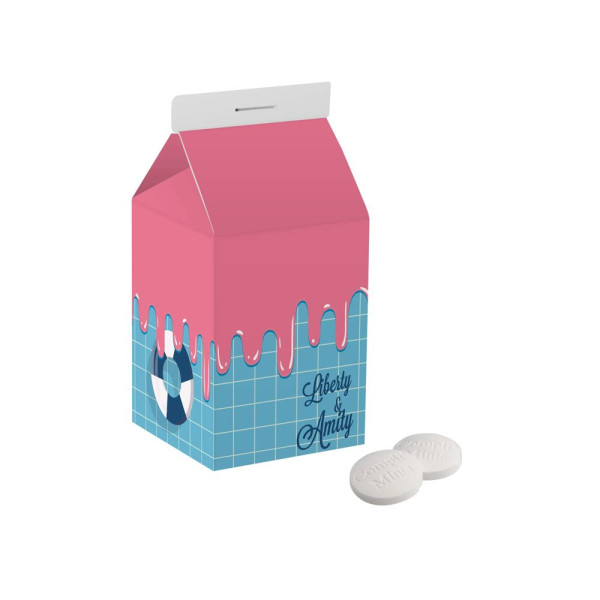 Vollfarbig bedruckter Milchkarton, gefüllt mit ca. 115 Gramm Compli'mints