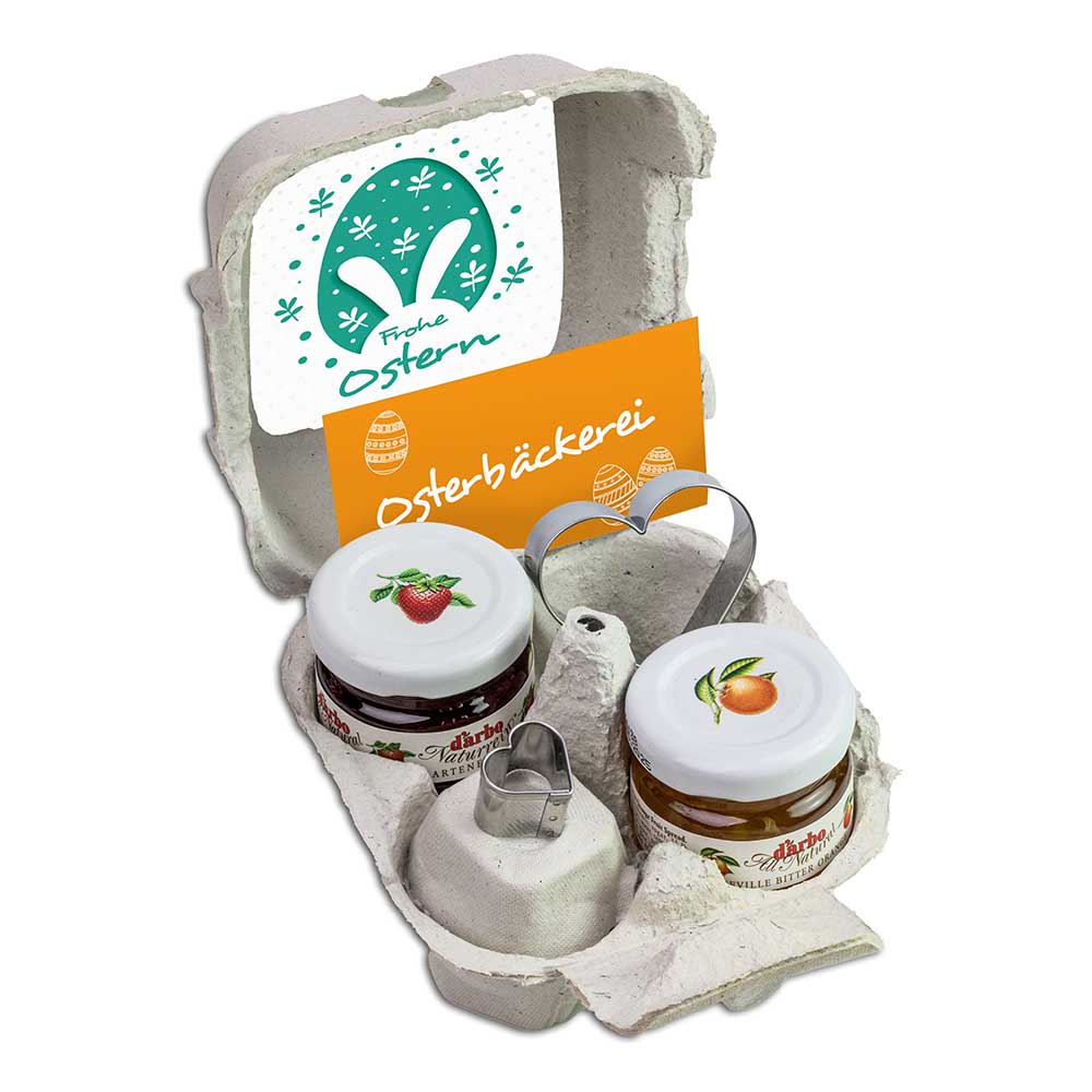 Das Backset mit Herz bringt frühlingshafte Freude in Ihre Osterbäckerei. Dieses sorgfältig zusammengestellte Set macht nicht nur das Backen zu einem Vergnügen, sondern sorgt auch für extra Osterfreude. In der hübschen Kartonverpackung befinden sich zwei Backförmchen in Herzform in verschiedenen Größen, ideal für die Zubereitung von leckerem Ostergebäck. Ein kleiner Rezeptflyer mit zwei Backrezepten ist ebenfalls enthalten. Zusätzlich umfasst das Set zwei Gläschen feiner Konfitüre in den Geschmacksrichtungen Erdbeere und Orange. Die quadratische Box aus hochwertigem Recyclingkarton wird einem individuellen Werbeaufkleber auf der Außen- oder Innenseite personalisiert werden.