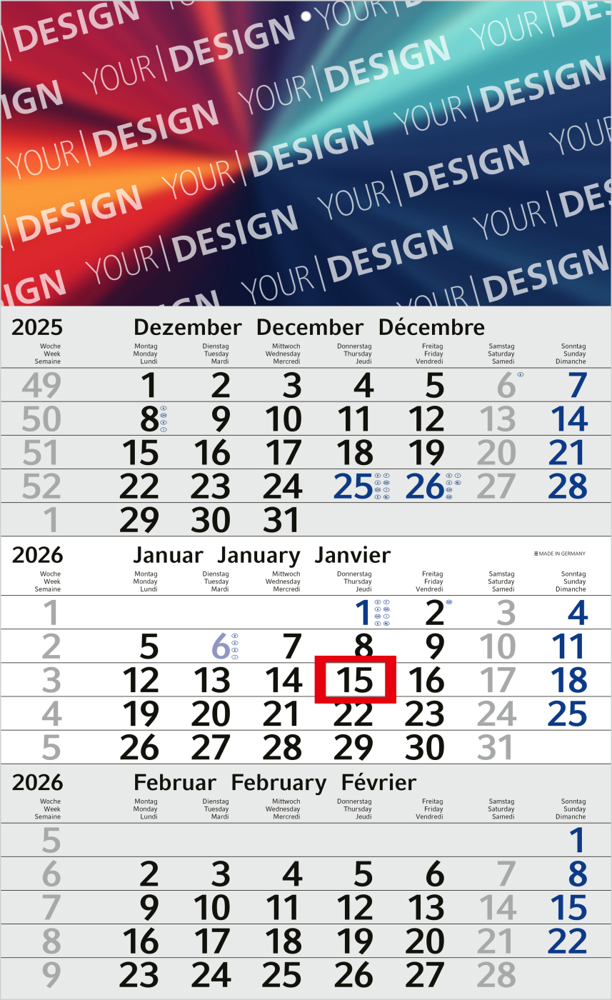 Der Budget 3 Bestseller ist der ideale Kalender für kostenbewusste Unternehmen, die auf Übersicht und Werbewirkung setzen. Mit einem modernen 3-Monatskalendarium, klarer Typografie und einem individuell bedruckbaren Kopfteil kombiniert er Funktionalität mit attraktivem Design. Ein zuverlässiges Werbemittel, „Made in Germany“.