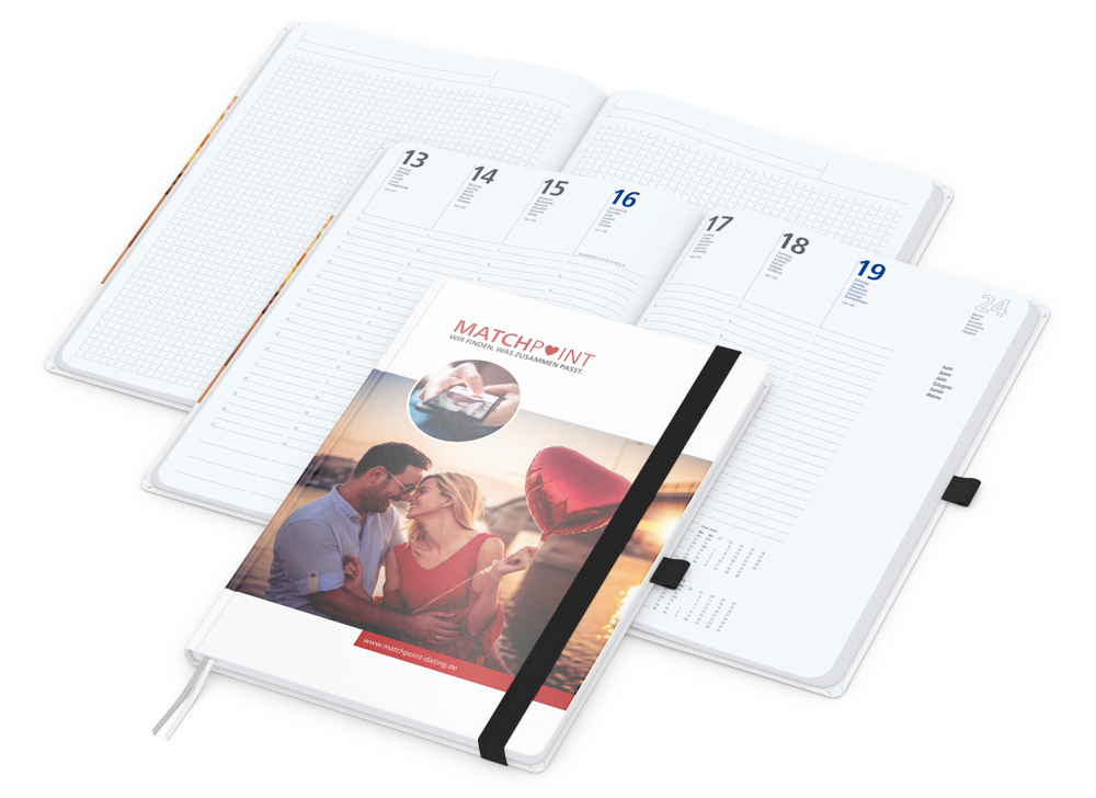 Der Match-Hybrid White Bestseller kombiniert edles Design und praktische Funktionen, ideal für professionelle Planung und Markenpräsenz. Mit seinem klar strukturierten Wochenkalendarium und der hochwertigen Verarbeitung ist er ein vielseitiges Werbemittel.