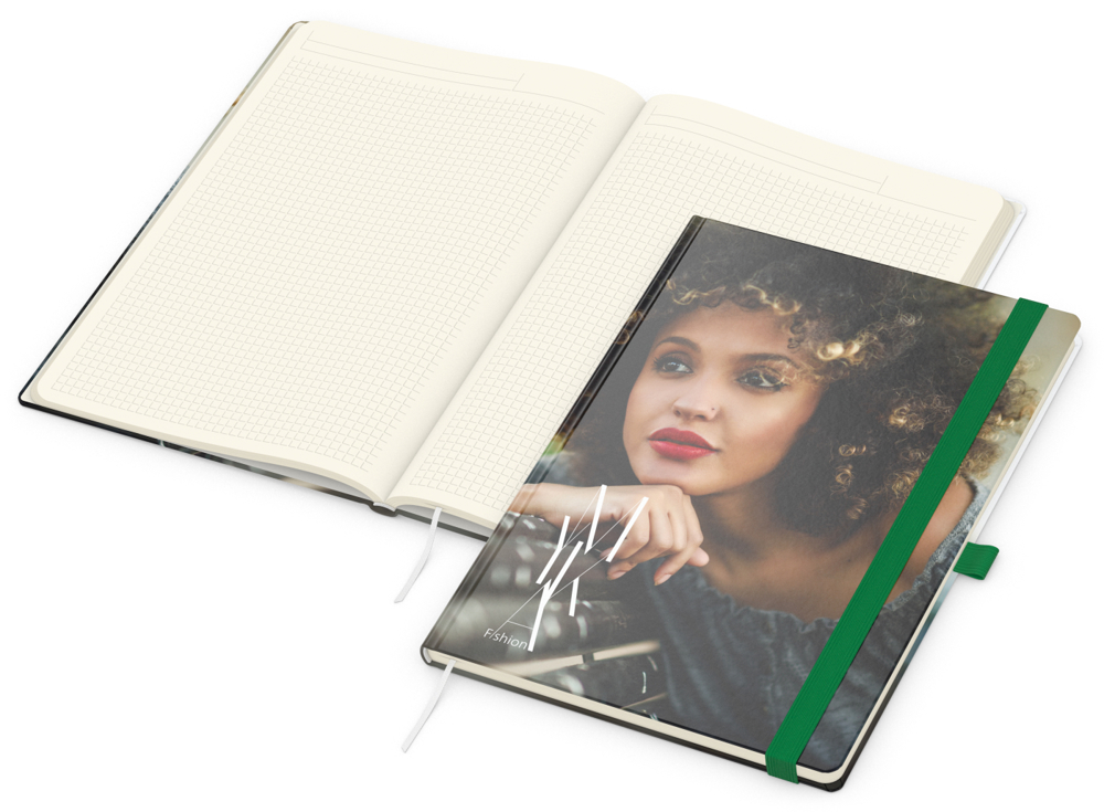 Notizbuch Match-Book Creme Bestseller, A4, Cover-Star, gloss-individuell, grün