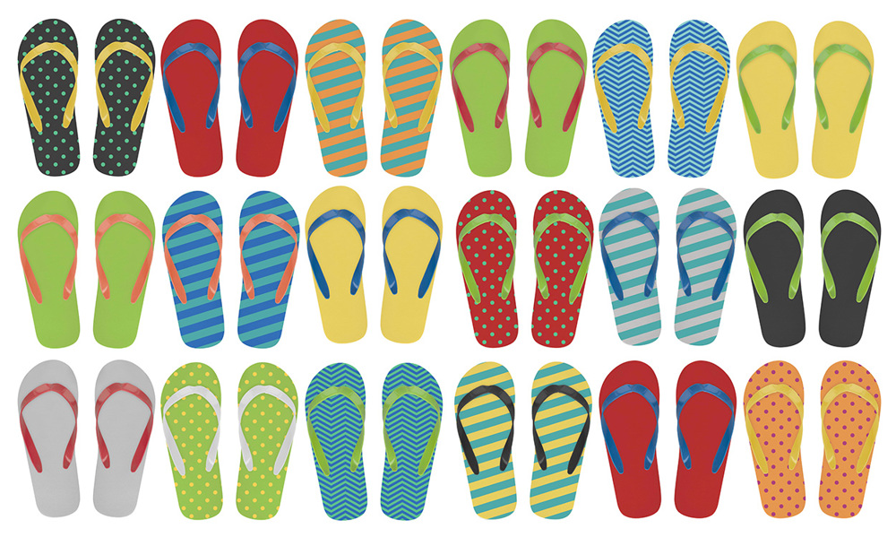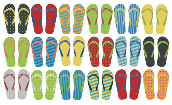 Zehensandalen mit PE-Sohle und PVC-Riemen. Die Farbe der Sohle und des Riemens kann individuell kombiniert werden. Mindestbestellmenge: 50 Paar je Farbkombination und Größe.