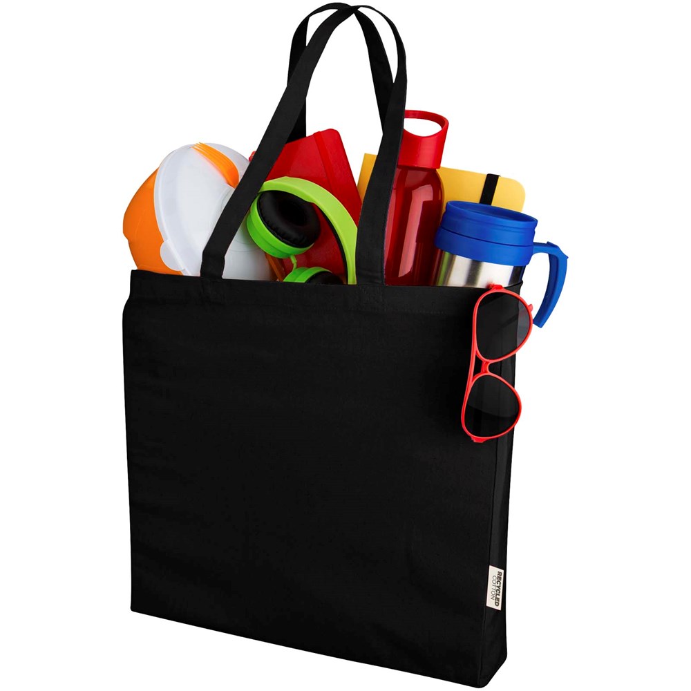 Die Odessa Tragetasche aus 100% GRS-Recyclingbaumwolle ist mit ihren 30 cm langen Schultergriffen und dem großen Hauptfach mit Zwickel für bequemes Tragen konzipiert. Ob für schwere Bücher oder Lebensmittel, diese Tasche ist für alle Bedürfnisse geeignet. Die für diese Tragetasche verfügbaren Druckverfahren sind ebenfalls GRS-zertifiziert, sodass die gesamte Lieferkette transparent und zertifiziert ist. Die 220 g/m² Baumwolle sorgt für Langlebigkeit und Zuverlässigkeit und verleiht der Tasche eine Belastbarkeit von bis zu 10 kg. Hergestellt in Indien. Kapazität: 13 Liter.