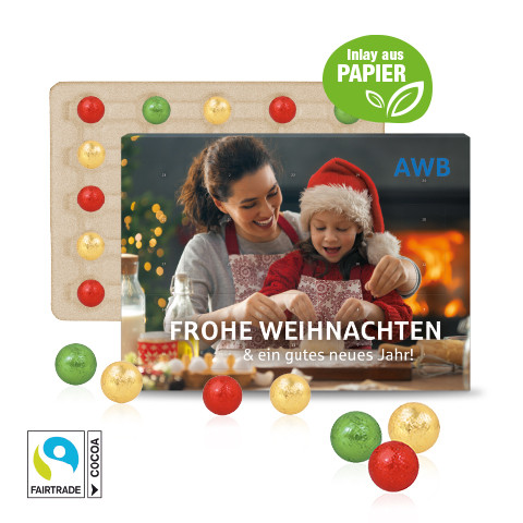 Adventskalender mit Fairtrade® Schokolade! 24 leckere Milchschokoladenkugeln versüßen die Vorweihnachtszeit in diesem individuell bedruckbaren Advetnskalender. Das Papier-Inlay kann nach Weihnachten zusammen mit der Kalenderhülle im Altpapier recycelt werden. Produktdetails: Schokoladen-Adventskalender in hochwertiger Vollkartonhülle, (FSC®-zertifiziert). 4-farbig bedruckt, im Hoch- oder Querformat, mit Aufhängeloch und Tischaufsteller. Gleich mitbestellen: Stabiler Einzelkarton für den Postversand an Ihre Kunden: 0,75 Euro pro Stück. Nachhaltigkeit: Wir verwenden FSC®-zertifizierten Karton aus nachhaltiger Forstwirtschaft und anderen kontrollierten Quellen. Inlay aus Papier, Entsorgung zusammen mit Altpapier. Für jede Bestellung mit uns wird ein Baum über Grow my Tree gepflanzt.