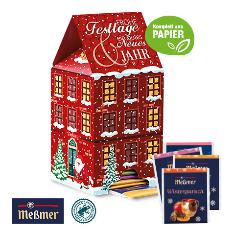 Sehr beliebt in Büros: 24 Tage Teegenuss! Mit einem Tee-Adventskalender wird Ihre Werbung zum Mittelpunkt. Die hochwertige Füllung mit hochwertigen Teeköstlichkeiten aus dem Hause Meßmer verwöhnt anspruchsvolle Teefreunde. Produktdetails: Tee-Adventskalender in hochwertiger Vollkartonhülle in Haus-Form, mit Spender (FSC®-zertifiziert). 4-farbig bedruckt. Nachhaltigkeit: Wir verwenden FSC®-zertifizierten Karton aus nachhaltiger Forstwirtschaft und anderen kontrollierten Quellen. Innenund Außenteil zu 100 % aus Karton, Entsorgung zusammen mit Altpapier. Für jede Bestellung mit uns wird ein Baum über Grow my Tree gepflanzt.