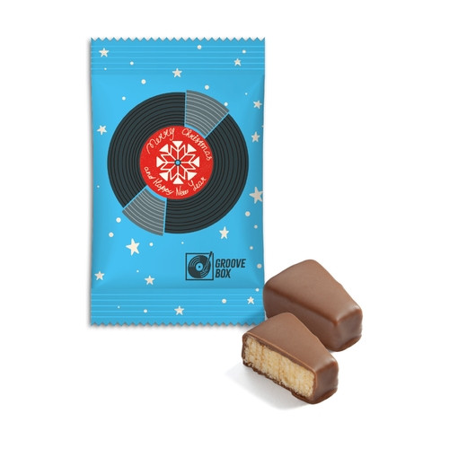 Die Baumkuchenstücke sind in dünnen Schichten gebacken und vollständig von Vollmilchschokolade umhüllt. Sie werden in praktischen Werbetütchen verpackt und können nach Wunsch vollständig veredelt werden.