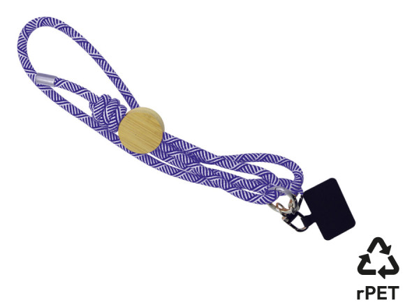 Lanyard aus RPET mit einer Länge von 160 cm und einer Dicke von 8 mm. Universelles und abnehmbares Pad aus Polyester zur Befestigung von Handys mittels ihrer Hülle. Ring und Enden der Schnüre aus rostfreiem Edelstahl. Inklusive Bambus-Schnalle.