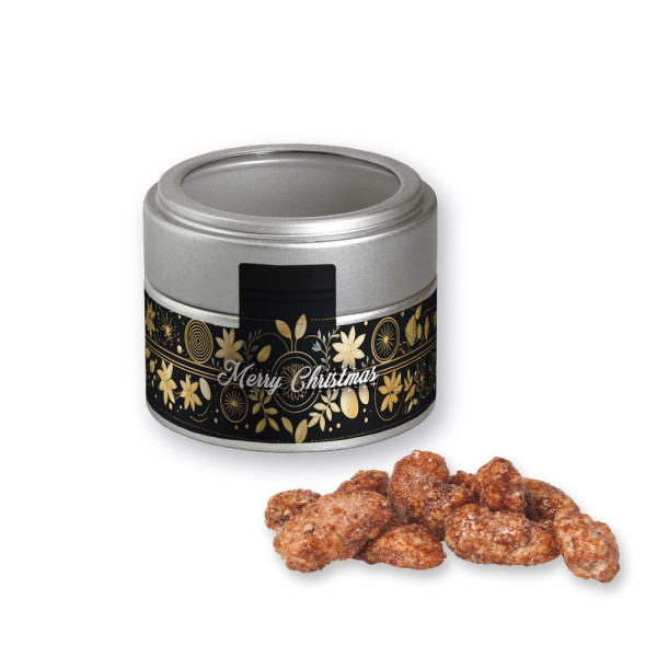 Feuergebrannte Mandeln, ca. 60g, Metalldose Mini mit Sichtfenster silber