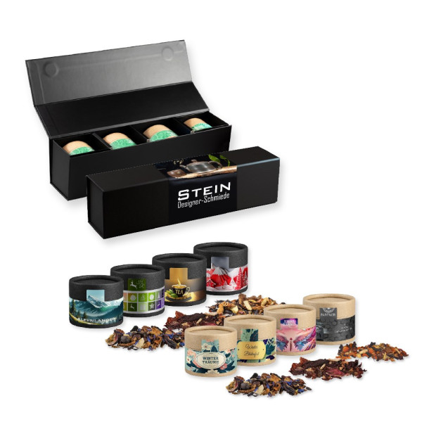 Verschiedene Weihnachts Teesorten, , ca. 80-120g, Geschenk-Set Premium schwarz mit Magnetverschluss und 4 Kraftpapierdosen Mini