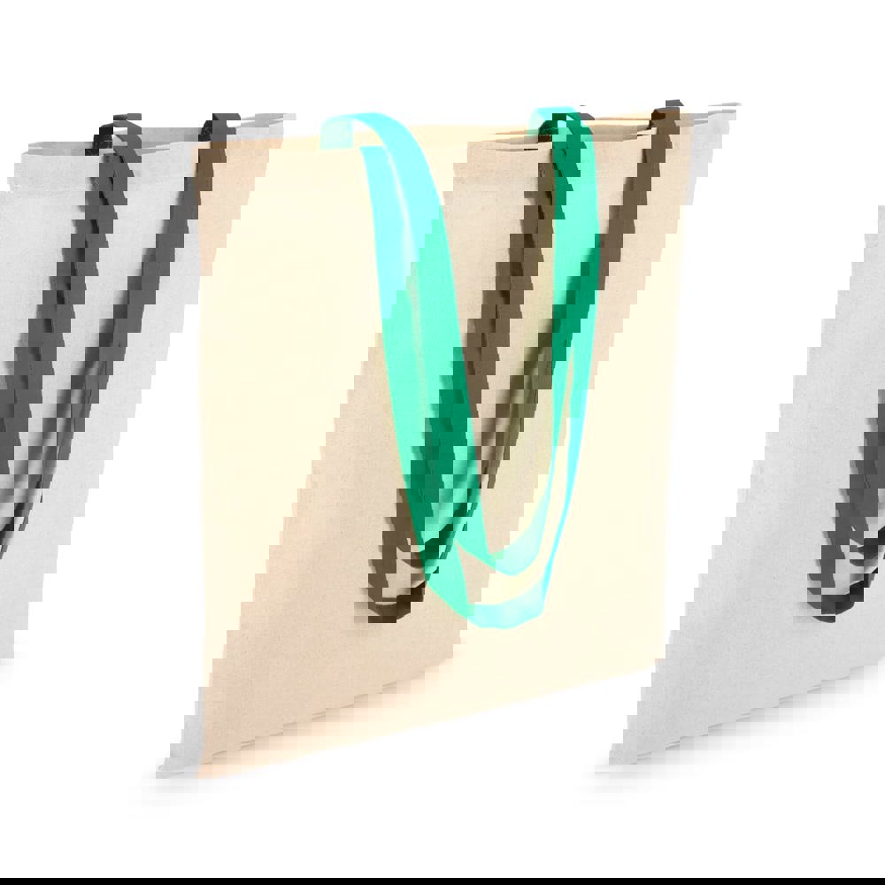 Klassische Tragetasche aus 140 g/m² Baumwolle mit natürlichem Körper und kontrastfarbenen Griffen. Lange Griffe für bequemes Tragen über der Schulter. Oeko-Tex®-zertifiziert. Ideal für Veranstaltungen, den Einzelhandel oder den täglichen Gebrauch.