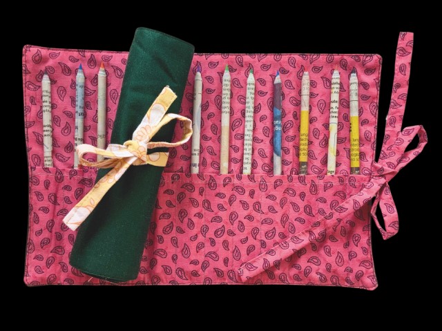inkl. 12 Stiften - entweder 12 verschiedene Farbstifte oder 6 Farbstiften und 6 Bleistiften in einer Textilrolle, inkl. Logodruck auf Textilrolle und Stift