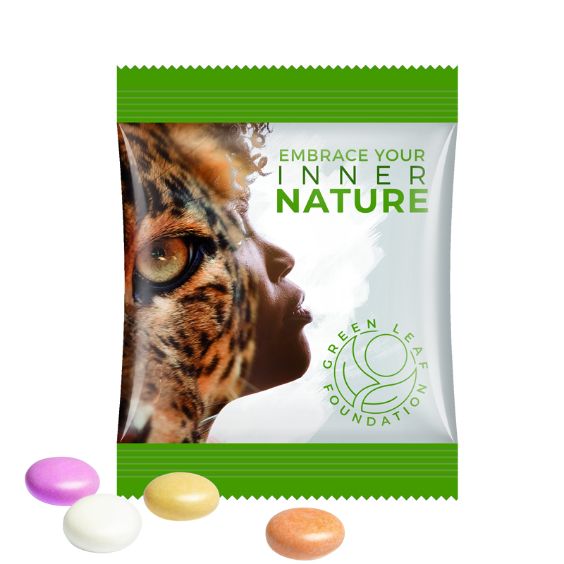 Mentos Kaudragees Fruit, in Tüte aus weißer Folie, individuell bedruckt. Inhalt: Mentos Kaudragee Fruit (Erdbeere, Orange, Zitrone - gemischt), 8 g
