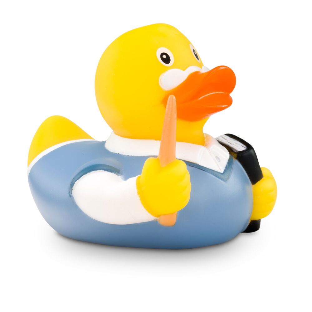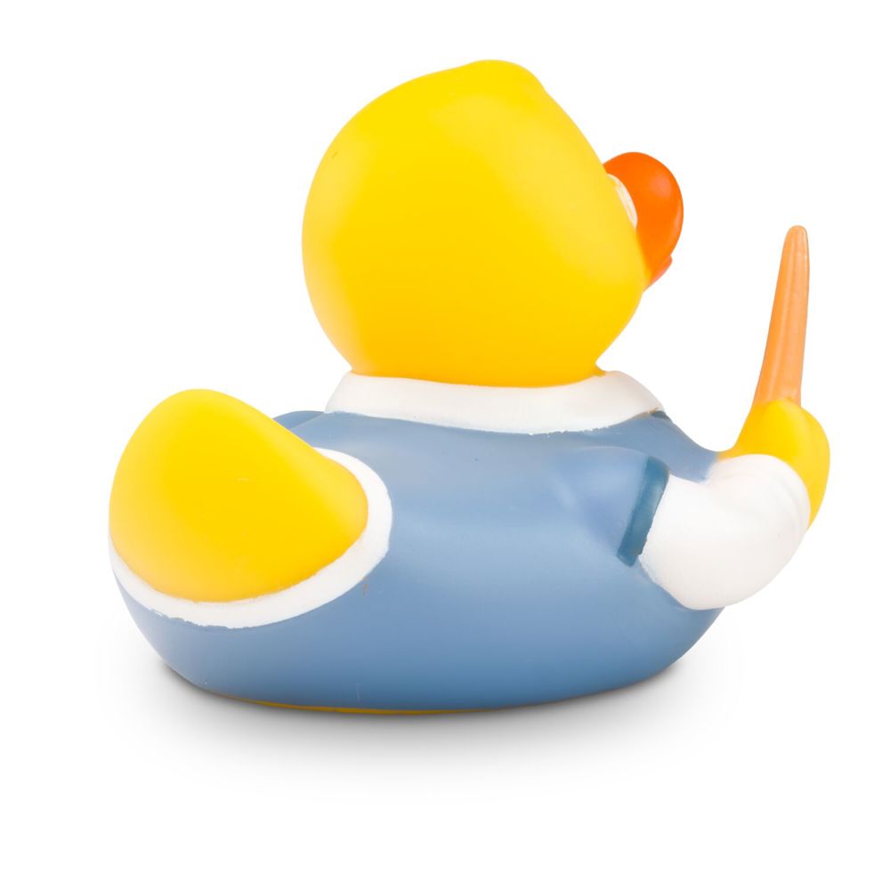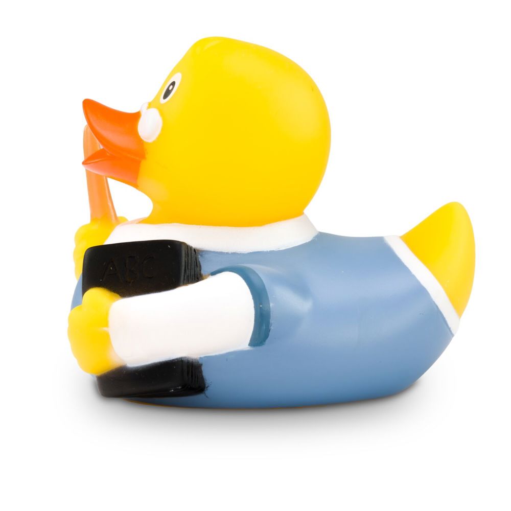 Leo Lehrer ist der Lieblingslehrer aller Kinder in der Enten-Schule. Klassisch mit Brille, blauem Oberteil, weißem Hemdkragen, Lehrbuch und Zeigestock sieht er sehr streng aus. Dabei gibt er den Entenkindern mit viel Charme und Geduld das Wissen seiner Generation über den Ententeich weiter. Größe: ca. 8 cm. Inklusive Quietschventil