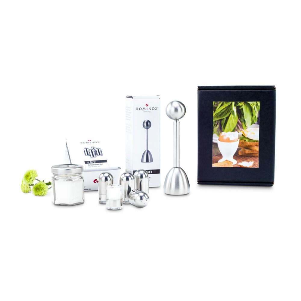 Mit dem charmanten Set „Frühstücks(dr)eierlei“ beginnt der Start ins Wochenende mit Stil, Funktion und einem Augenzwinkern. Sie erhalten drei Dinge, die Sie für ein perfektes Frühstücksei brauchen: einen ROMINOX® Profi Eierköpfer, ein Glas mit feinem Meersalz (50 g)und ein Set aus vier eleganten ROMINOX® Minisalzstreuern. Sie brauchen nur noch ein perfekt gekochtes Ei. Die Salzstreuer haben eine moderne glänzende Oberfläche aus Edelstahl, sind einfach zu befüllen und haben einen transparenten Boden für eine einfache und schnelle Füllstandprüfung. Füllen Sie einfach das mitgelieferte Meersalz ein, um es fein dosiert auf Ihrem Frühstücksei zu verteilen. Damit Sie dieses stilvoll öffnen können, sorgt der ROMINOX® Eierköpfer aus Edelstahl mit praktischer integrierter Feder für eine klare Schnittkante ganz ohne Schalenkrümel. Die Utensilien für Ihr perfektes Frühstücksei kommen verpackt in einer edlen schwarzen Geschenkbox mit stimmungsvollem Frühstücksei-Aufkleber, welcher das Präsent zu einer stilvollen Liebeserklärung an die wichtigste Mahlzeit des Tages macht.