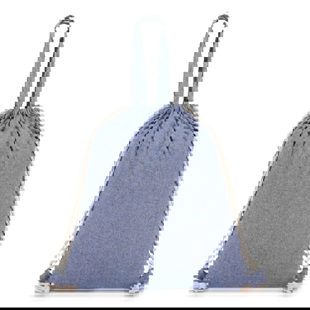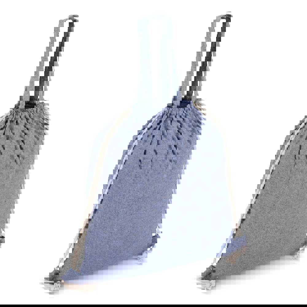 Praktischer Kordelzugbeutel mit Tragegriffen aus recycelter Baumwolle. Die recycelte Baumwolle, die von unterschiedlicher Herkunft ist, verleiht dem Stoff eine einzigartige Optik und Haptik. Die unvermeidlichen Farbabweichungen sind ein Zeichen für den Recycling-Charakter dieser Tasche.