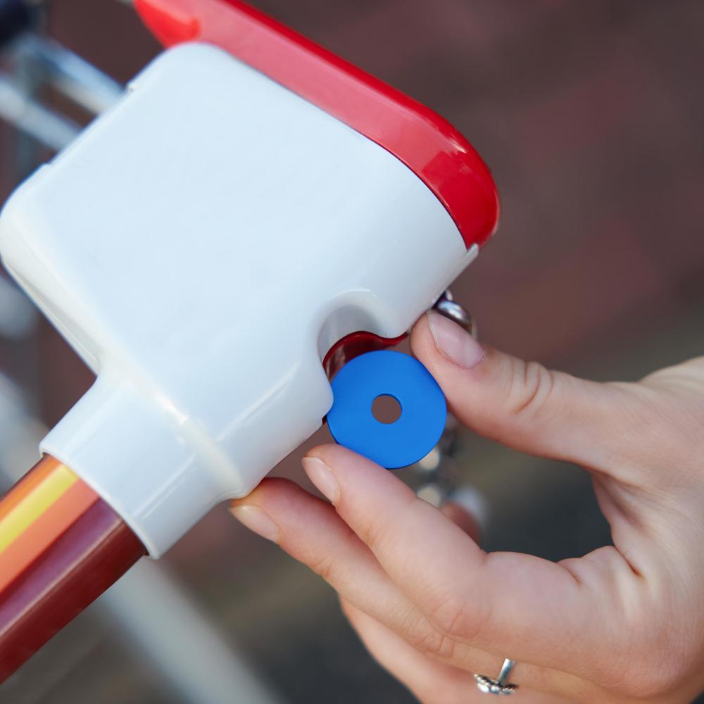 Einfacher Einkaufswagenchip aus Kunststoff mit einem Loch in der Mitte. mehr