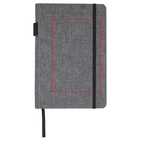 A5 Notizbuch mit einem Cover aus RPET-Stoff. Mit 96 Blatt, 70 g/m² recyceltes Papier mit liniertem Layout, Stiftschlaufe und Leseband. Verpackt in einer Kartonhülle.