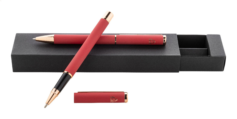Kugelschreiber- und Tintenrollerset aus recyceltem Aluminium mit gummierter Oberfläche und roségoldenen Details, blauschreibend. Mit Spezialbeschichtung für Spiegelgravur in Roségold. Einzeln in schwarzer Geschenkbox aus Papier.