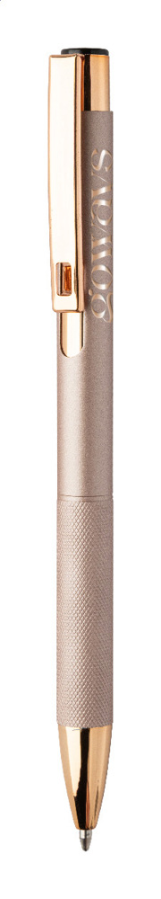 Kugelschreiber aus recyceltem Aluminium mit mattiertem Gehäuse, strukturiertem Griffstück und Roségold-Details, blauschreibend. Mit Spezialbeschichtung für Spiegelgravur in Roségold.