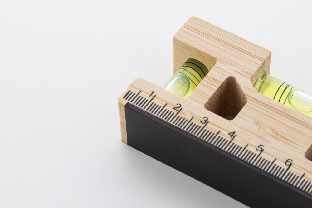 Multifunktionaler Schlüsselanhänger aus Bambus mit Metallring, Lineal, Magnet und zwei Wasserwaagen.
