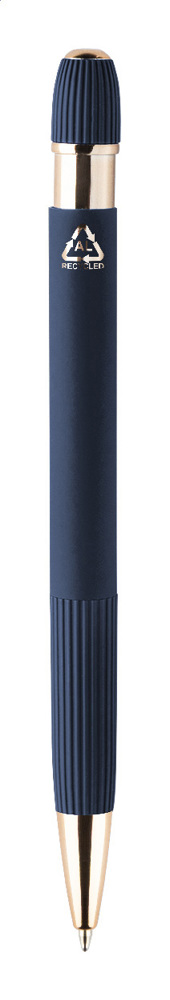 Kugelschreiber aus recyceltem Aluminium mit gummiertem Gehäuse und roségoldenen Details, blauschreibend. Mit Spezialbeschichtung für Spiegelgravur in Roségold.
