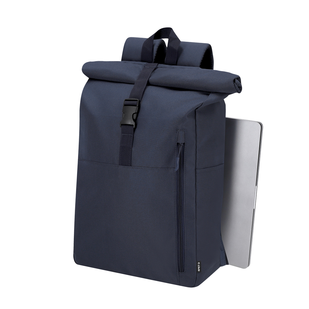 Rucksack aus strapazierfähigem 300D RPET mit Rollverschluss und Schnalle. Mit zwei Fronttaschen, einer Rücktasche mit seitlichem Zugang und zwei zusätzlichen Seitentaschen. Geräumiges Innenfach mit gepolstertem Fach für Laptops bis 15 Zoll. Gepolsterte Schultergurte und Rückenpartie. Mit Gepäckband zur Befestigung am Trolley oder Koffer – ideal für Reisen und Pendeln. RPET-Material wird aus recyceltem Kunststoff hergestellt, um die Wiederverwendung von Plastikabfällen zu fördern und zur Nachhaltigkeit des Planeten beizutragen.