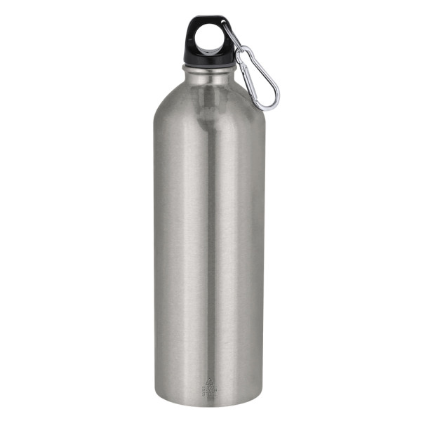 800 ml Flasche aus recyceltem Edelstahl mit Metallic-Finish. Schwarzer Schraubverschluss für optimale Abdichtung. Mit Metallkarabiner für einfachen Transport. Mit Emblem aus recyceltem Edelstahl. Stahl ist eines der gefragtesten Materialien und findet sich fast überall, von Alltagsprodukten bis hin zu großen Bauwerken. Mit unzähligen Eigenschaften, insbesondere Haltbarkeit und hohem Wiederverwendungsgrad, ist er eine sehr geschätzte Alternative für nachhaltige Lösungen. Richtig behandelt, liefert er neue Ressourcen für unendliche Nutzung.
