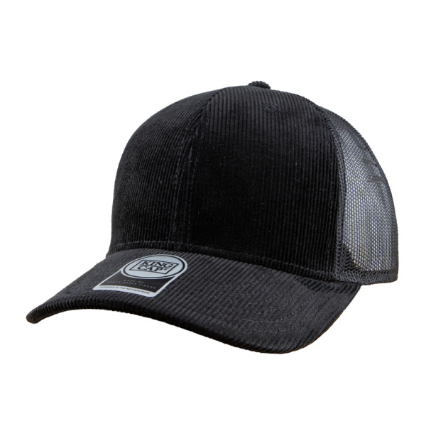 6 Panel Trucker Cap mit Frontfütterung. Mittleres Profil. Kunststoff-Schnappverschluss. Hergestellt aus recyceltem Mesh und Cord.