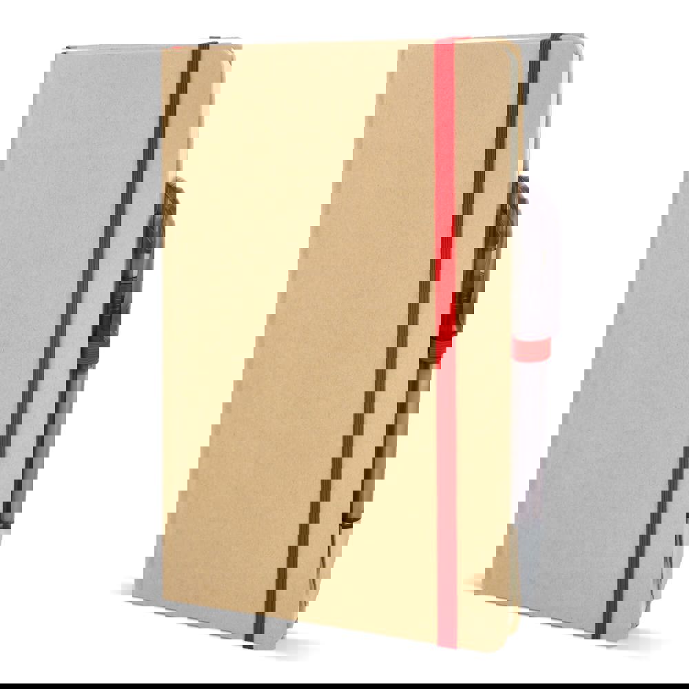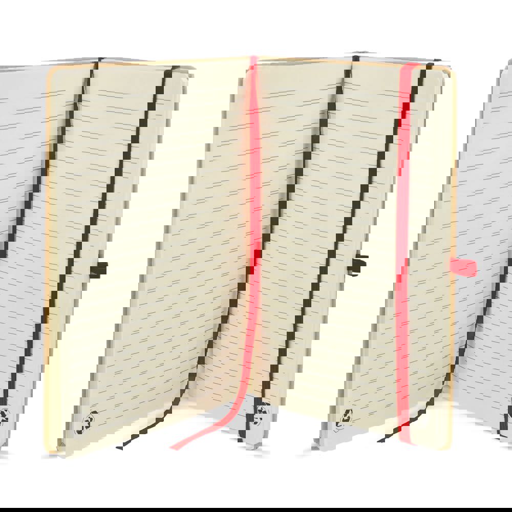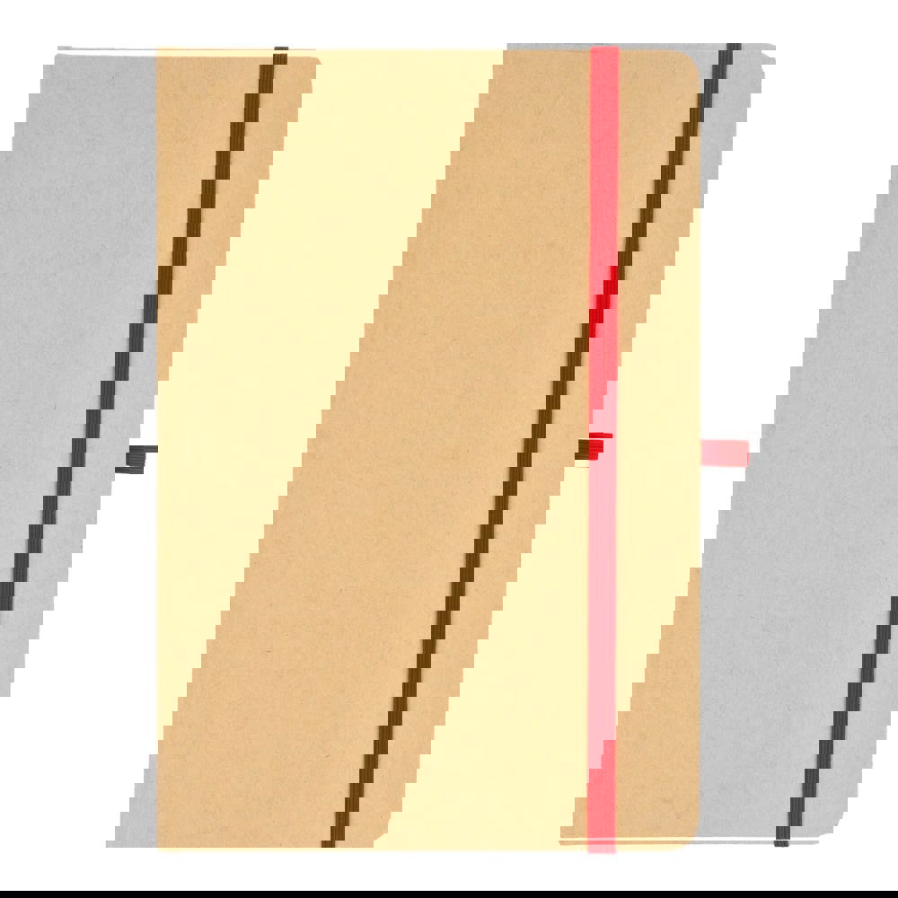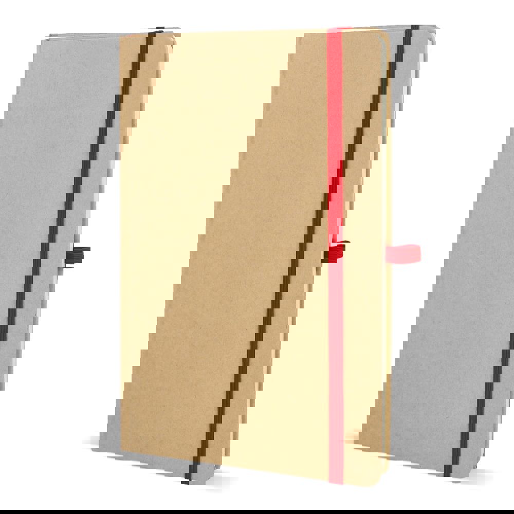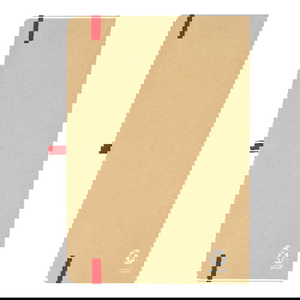 A5-Notizbuch mit Kartoneinband, abgerundeten Ecken, farbigem Gummiverschluss, Lesebändchen und Stiftschlaufe. Enthält 80 linierte cremefarbene Blätter aus Recyclingpapier. Eine praktische, umweltbewusste Wahl für den täglichen Gebrauch.