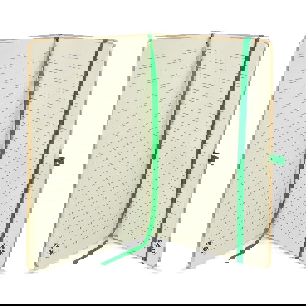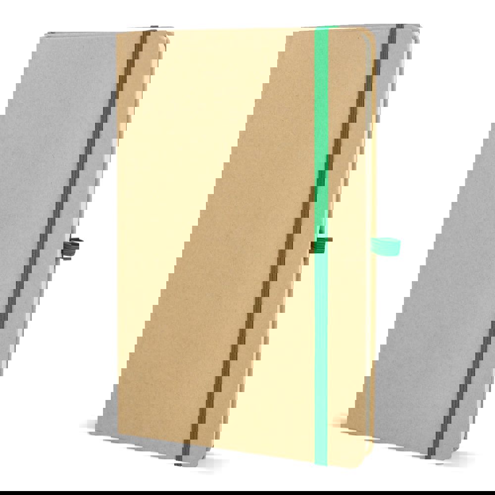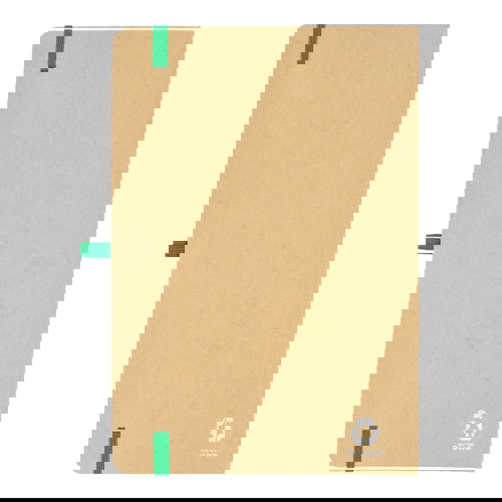 A5-Notizbuch mit Kartoneinband, abgerundeten Ecken, farbigem Gummiverschluss, Lesebändchen und Stiftschlaufe. Enthält 80 linierte cremefarbene Blätter aus Recyclingpapier. Eine praktische, umweltbewusste Wahl für den täglichen Gebrauch.