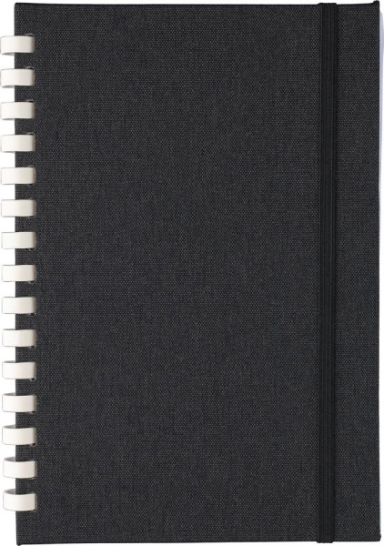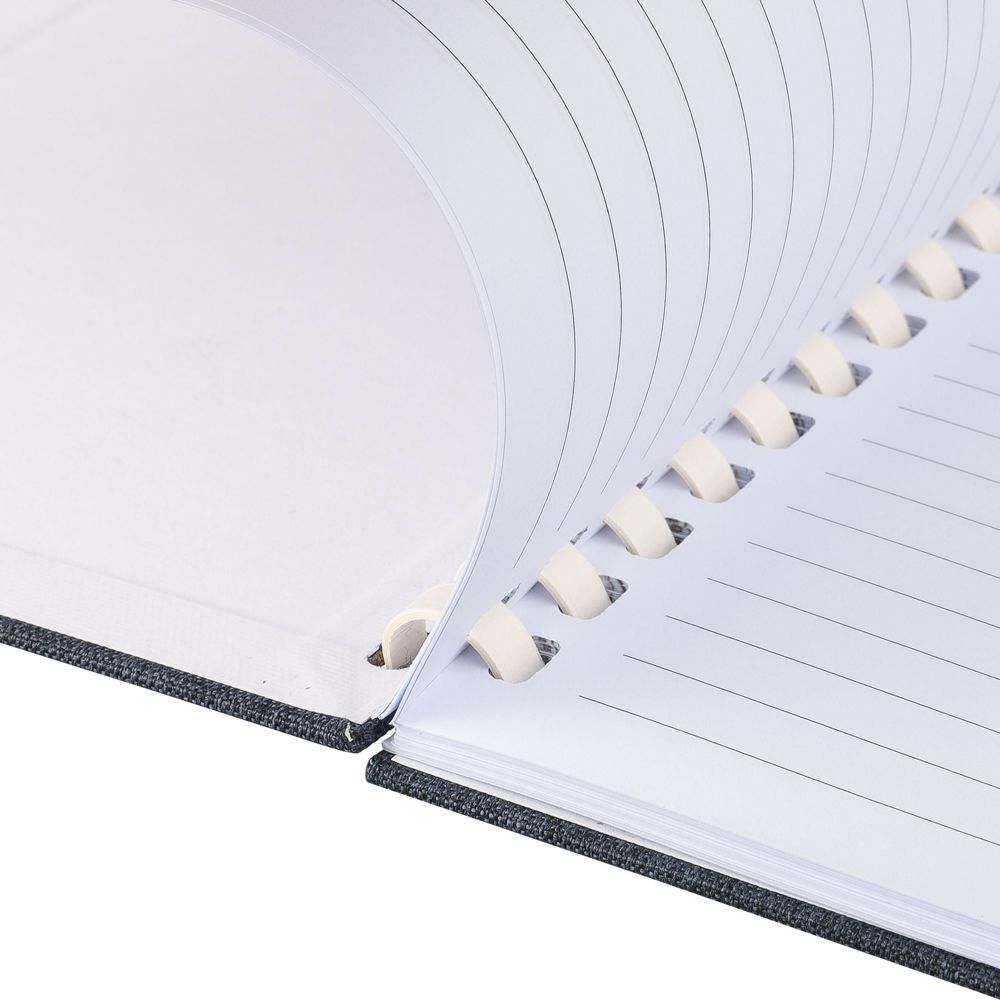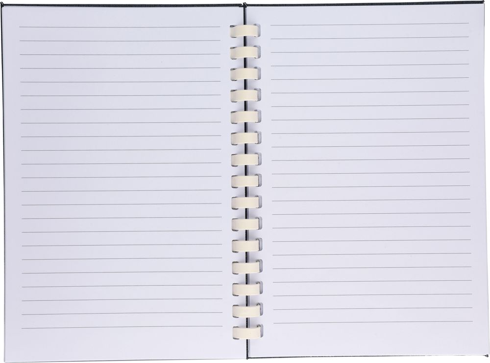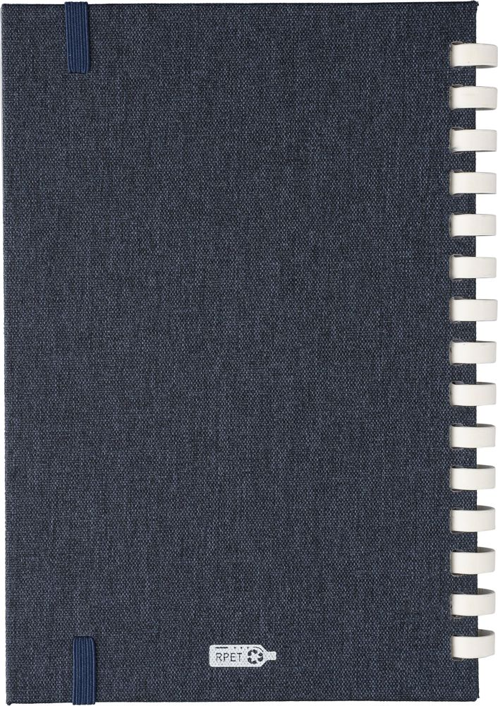 rPET-Notizbuch (ca. A5) mit hartem Einband und elastischem Verschlussband. Es verfügt über eine weiße Pappspirale mit 15 Ringen, ein Lesezeichen mit Band und 80 Blatt (70 g/m²) liniertes Papier. Auf der Rückseite befindet sich ein rPET-Logo. Das Notizbuch ist in Seidenpapier eingewickelt und nicht in einem Polybeutel.
