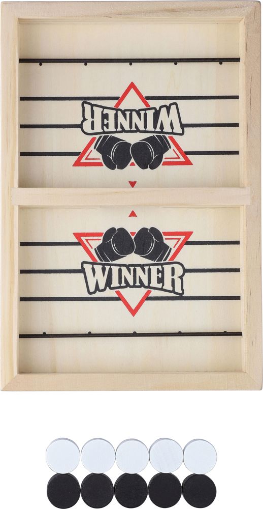 Enthalten sind zehn Spielchips – fünf in Weiß, fünf in Schwarz – sowie eine leicht verständliche Anleitung für Aufbau und Spielverlauf. Das Geschicklichkeitsspiel für Erwachsene besteht aus insgesamt elf Teilen. Alle Elemente sind einzeln in einer braunen Pappschachtel mit illustrierter Vorderseite verpackt.