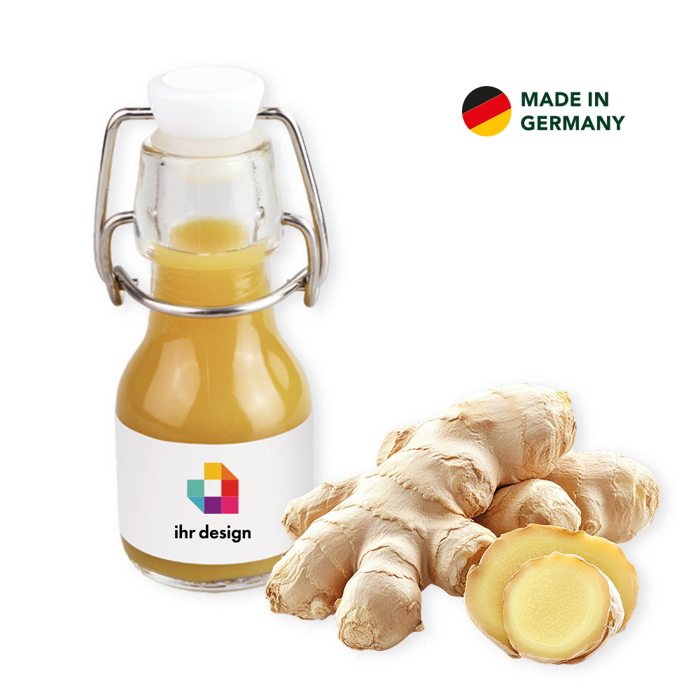 Power Kick für Zwischendurch: Ingwer-Shot in 60 ml in unterschiedlichen Geschmacksrichtungen: Cranberry, Holunder, Ingwer, Karotte oder Sauerkirsch in der Bügelglasflasche. Mit individuellem Etikett. Größe: Ø 29 x 120 mm Inhalt: 60 ml Ingwershot
