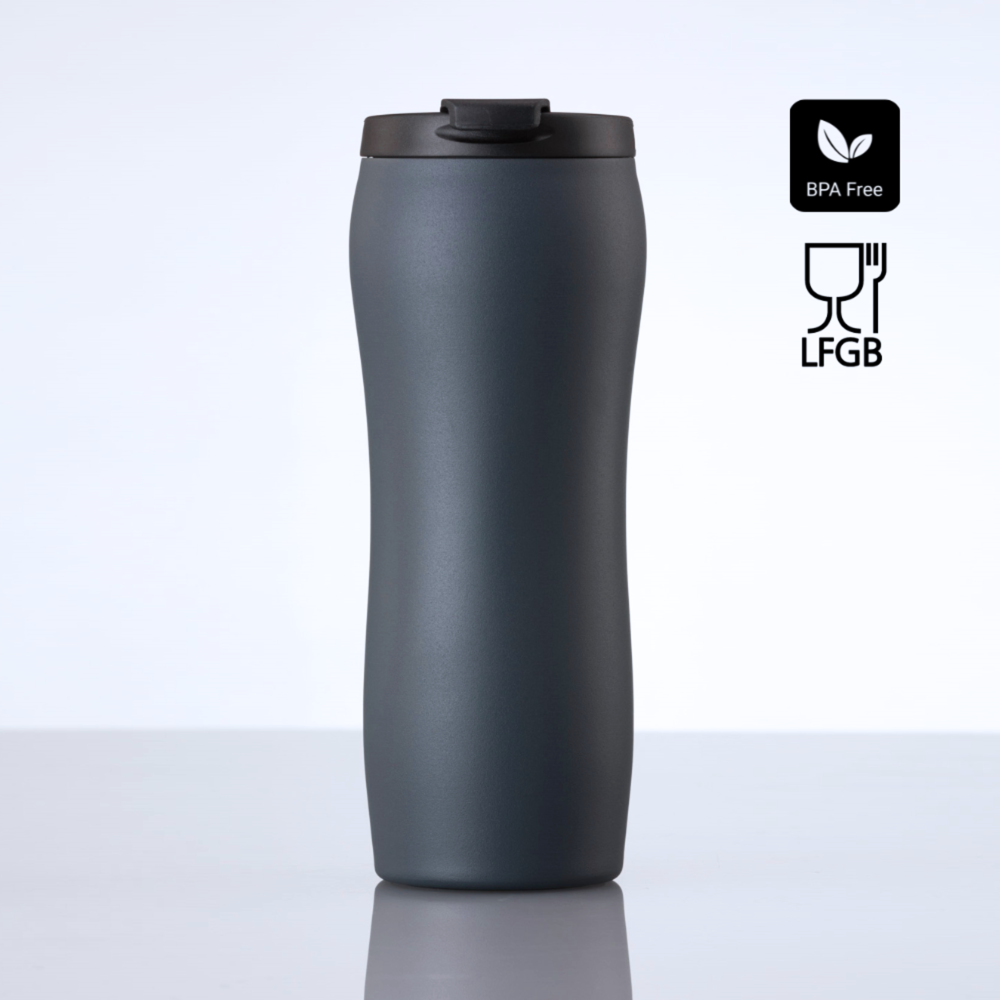 Auslaufsicherer Thermobecher aus hochwertigem Edelstahl, veredelt mit einer matten Pulverbeschichtung, die nicht nur Haltbarkeit, sondern auch ein tolles Aussehen bietet. Doppelwände halten die gewünschte Temperatur bis zu 6 Stunden lang perfekt. Der Klickverschluss hält Ihr Getränk heiß und sicher.