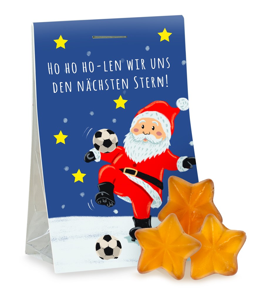 Lieferzeit: 14 Werktage nach Druckfreigabe Haltbarkeit: 12 Monate bei sachgerechter Lagerung Inhalt: 15 g Fruchtgummi Zimtsterne Druckfläche: 172 x 55 mm, Klappkarte beidseitig Größe: 86 x 55 x 35 mm VPE: 125
