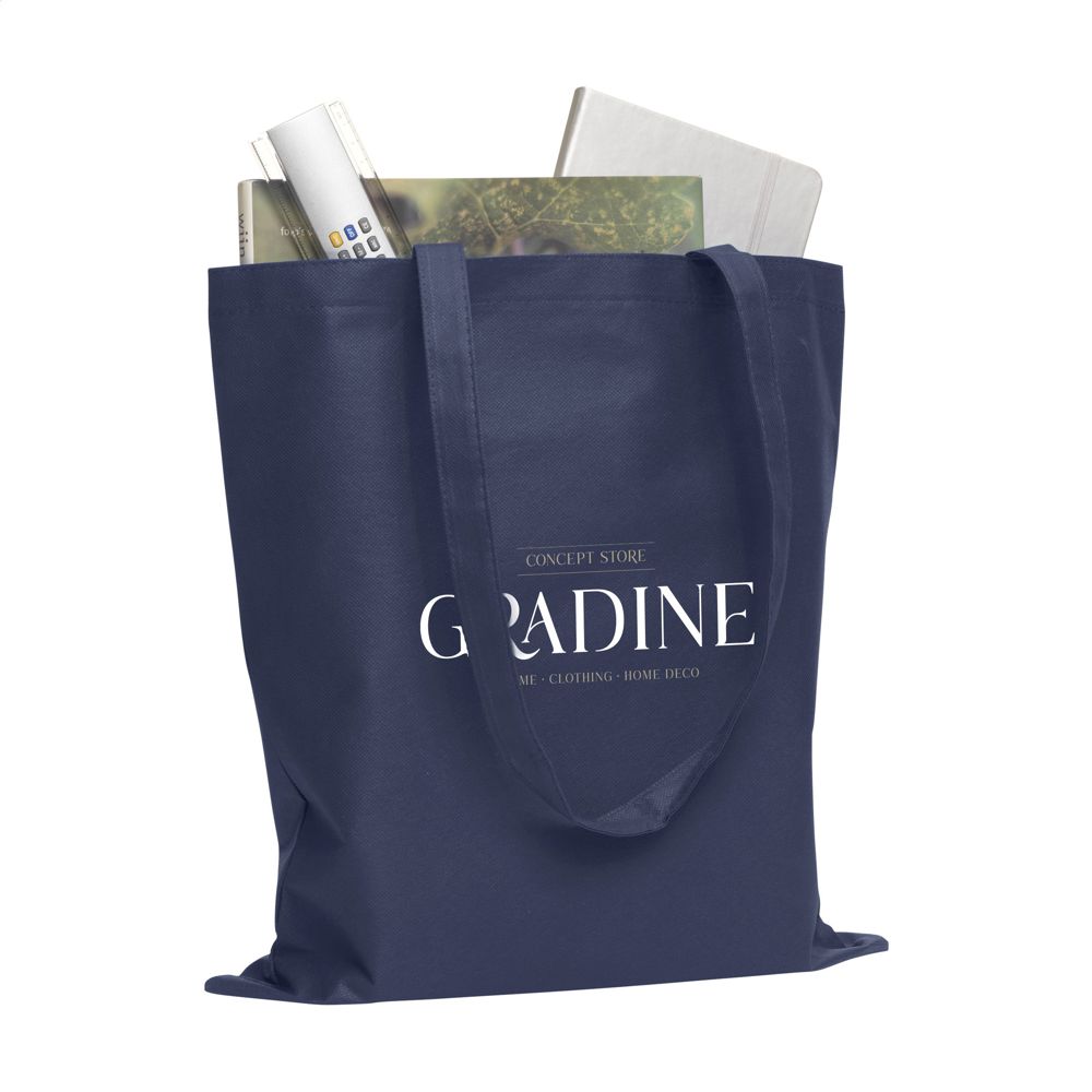 Einkaufstasche mit langen Henkeln aus "non woven" Material (80 g/m²): eine superleichte, starke Kunstfaser. Fassungsvermögen ca. 8 Liter.