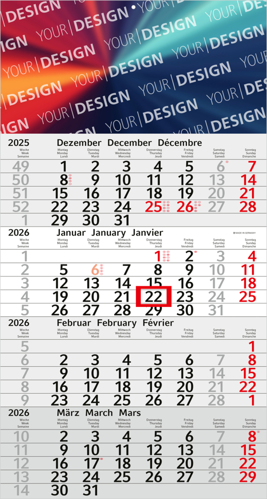 Der Budget 4 x.press ist die ideale Wahl für Unternehmen, die einen funktionalen und modernen 4-Monatskalender benötigen, ohne auf schnelle Verfügbarkeit zu verzichten. Mit einer Produktionszeit von nur 3 Arbeitstagen, rot akzentuiertem Kalendarium und einer großzügigen individuell bedruckbaren Werbefläche überzeugt dieser Kalender durch Qualität und Flexibilität. Perfekt für kurzfristige Marketingaktionen.