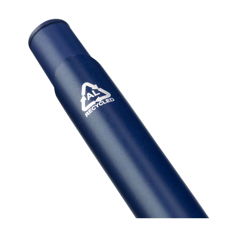 Blau schreibender Kugelschreiber mit einem Gehäuse aus 100% recyceltem Aluminium. Mit Metallclip, Kunststoffspitze und Druckknopf. RCS-zertifiziert. Durch die Verwendung von recyceltem Aluminium werden bei der Herstellung dieses Produkts weniger neue Rohstoffe verwendet. Das bedeutet weniger Energieverbrauch und weniger Wasserverbrauch.