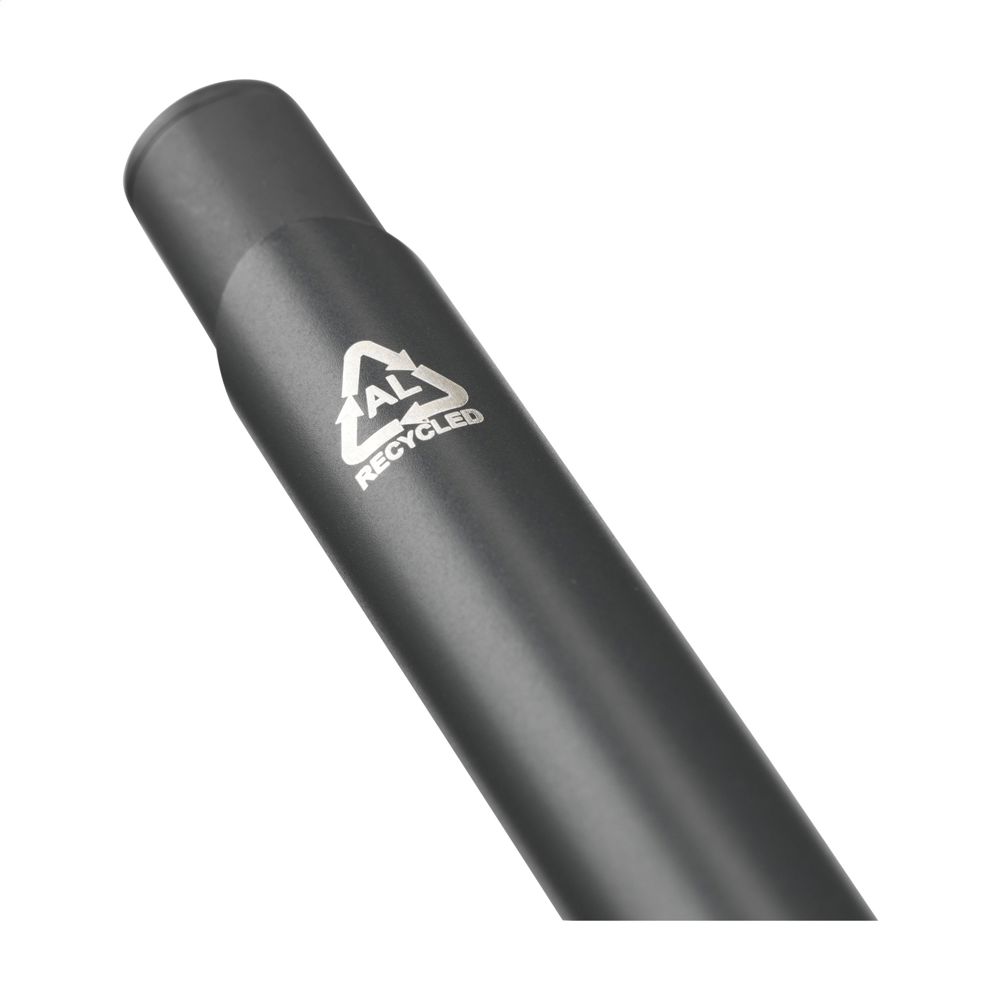 Blau schreibender Kugelschreiber mit einem Gehäuse aus 100% recyceltem Aluminium. Mit Metallclip, Kunststoffspitze und Druckknopf. RCS-zertifiziert. Durch die Verwendung von recyceltem Aluminium werden bei der Herstellung dieses Produkts weniger neue Rohstoffe verwendet. Das bedeutet weniger Energieverbrauch und weniger Wasserverbrauch.