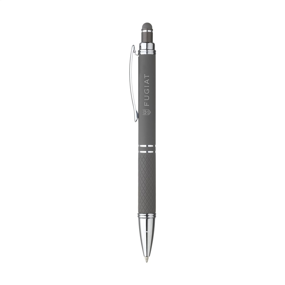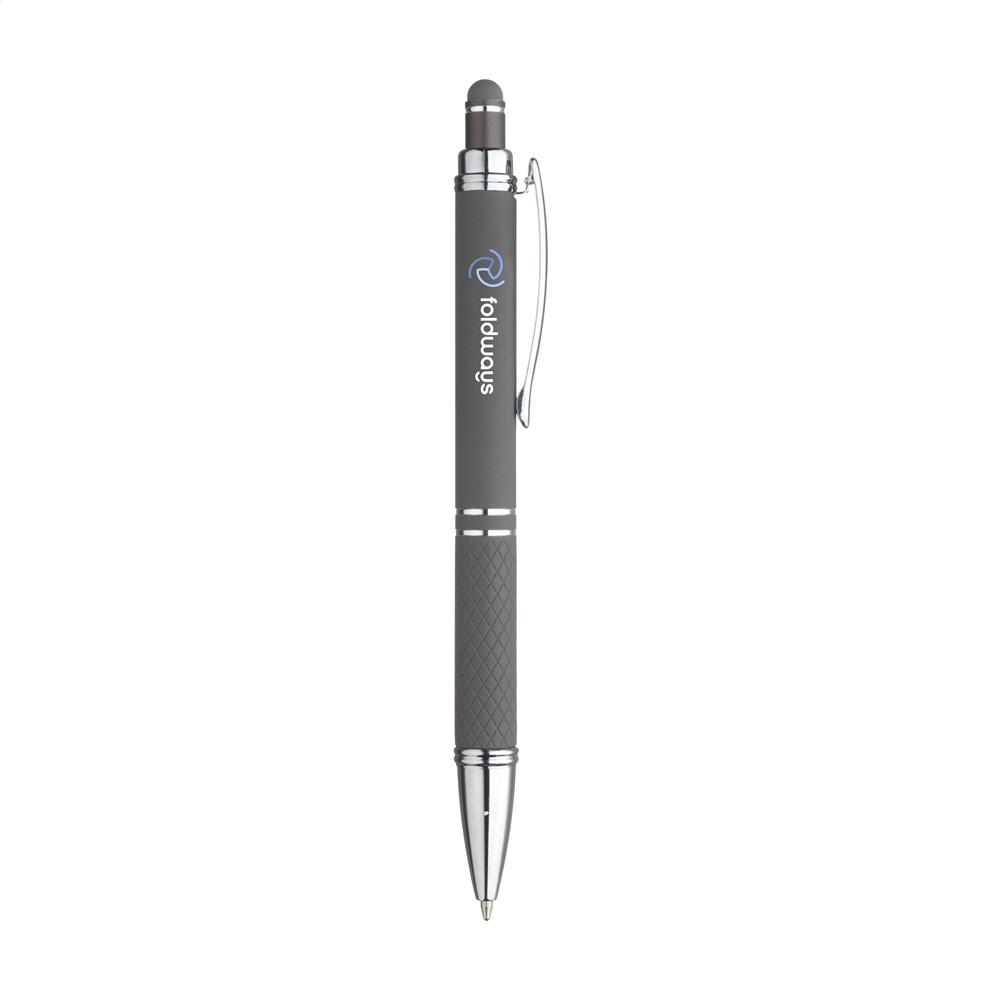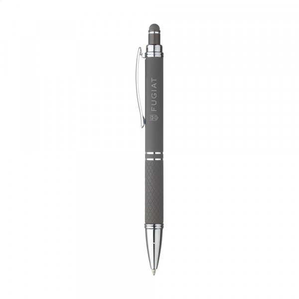 Blauschreibender Aluminium-Kugelschreiber mit Metallclip und gummierter Spitze für das Bedienen von Touchscreens (wie iPhone/iPad). Der Halter ist mit einer schönen gummierte Soft-Touch-Oberfläche versehen. Auf dem Vorderteil ist ein spielerisches Relief angebracht, das für einen festen Griff sorgt. Bei diesem Stift wurde viel Wert auf kleine zusätzliche Details gelegt. Das macht sein Design auffallend attraktiv.