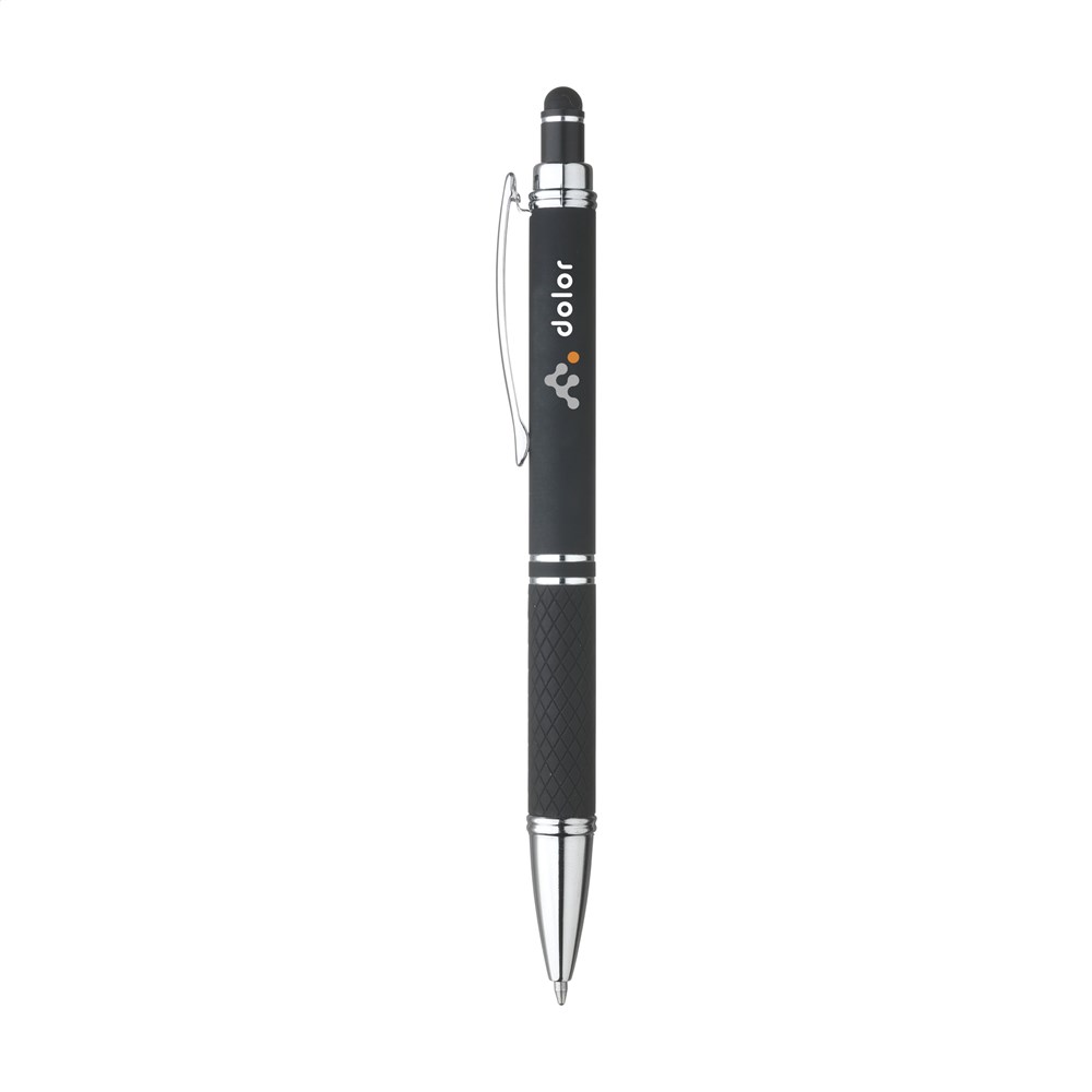Blauschreibender Aluminium-Kugelschreiber mit Metallclip und gummierter Spitze für das Bedienen von Touchscreens (wie iPhone/iPad). Der Halter ist mit einer schönen gummierte Soft-Touch-Oberfläche versehen. Auf dem Vorderteil ist ein spielerisches Relief angebracht, das für einen festen Griff sorgt. Bei diesem Stift wurde viel Wert auf kleine zusätzliche Details gelegt. Das macht sein Design auffallend attraktiv.